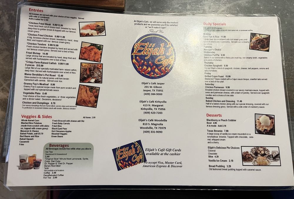 With excellent service and generous portions, Elijah's Cafe impresses even the most discerning palates. The friendly staff, fast service, and inviting ambience make it a must-visit spot for locals and travelers passing through. Whether you're indulging in the mouthwatering cobbler or savoring the perfectly cooked grilled chicken, each dish showcases the dedication to quality and flavor that defines Elijah's Cafe.